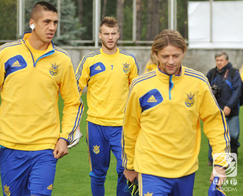 Игроки сборной Украины выходят на тренировку в рамках подготовки к матчу со сборной Испании.