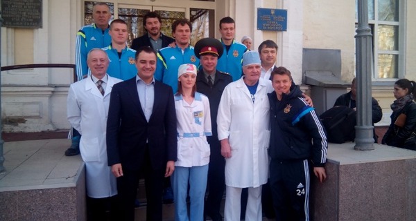 Сегодня игроки сборной Украины Анатолий Тимощук, Артем Федецкий, Руслан Ротань, Никита Бурда, Евгений Хачериди, Андрей Пятов, тренер вратарей национальной команды Юрий Сивуха, а также президент ФФУ Андрей Павелко и первый вице-президент Федерации Вадим Костюченко посетили столичный центральный военный госпиталь на Печерске.