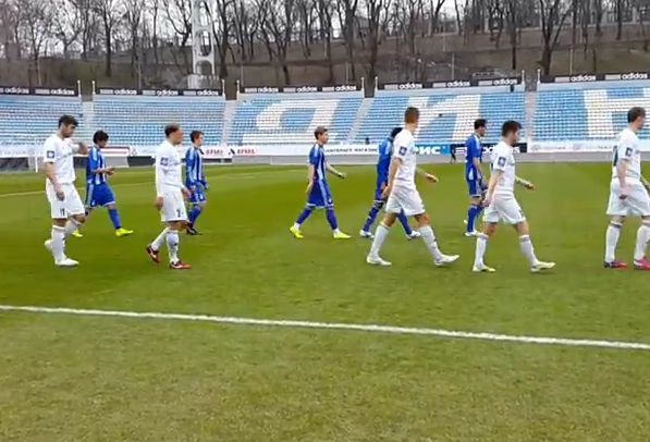 Игроки киевской и полтавской команд выходят на поле стадиона "Динамо" имени Лобановского на контрольный матч.