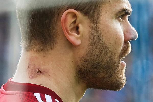 В сети появилась фотография ожога вратаря сборной России Игоря Акинфеева. Напомним, что голкипер ЦСКА получил ожог шеи и легкое сотрясение мозга на первой минуте матча отборочного турнира Euro-2016 Черногория – Россия после того, как в него прилете файер, запущенный с домашней трибуны.