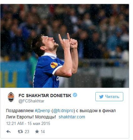 «Поздравляем «Днепр» с выходом в финал Лиги Европы! Молодцы!», – написал «Шахтер» в твиттере.