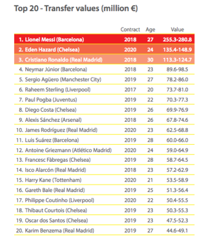 Удивительно, но ближайшим преследователем Месси стал не Роналду, а полузащитник Челси Эден Азар. Только три этих игрока стоят свыше ста миллионов евро.