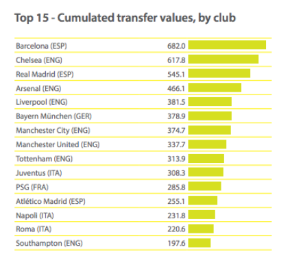Согласно CIES, самый дорогой состав у действующего победителя Лиги чемпионов Барселоны, следом располагаются Челси и Реал. Замыкают топ-5 Арсенал и Ливерпуль. Мерсисайдцы неожиданно опередили такие клубы, как Бавария, Ман Сити, Ман Юнайтед, Ювентус и ПСЖ.