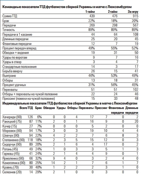 Газета «Команда» опубликовала выкладки технико-тактических действий футболистов сборной Украины в игре против Люксембурга.