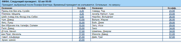 Шансы других кандидатов оцениваются как и прежде крайне низко. Коэффициент на победу шейха Ахмад Аль-Фахад Аль-Сабаха равен 6.00, а президента Конфедерации футбола Океании Дэвида Чунга – 13.00.