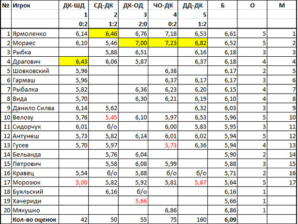 Б - средний балл, О - количество оценок, М - место в рейтинге. Желтым выделена лучшая оценка в матче, красным - худшая.