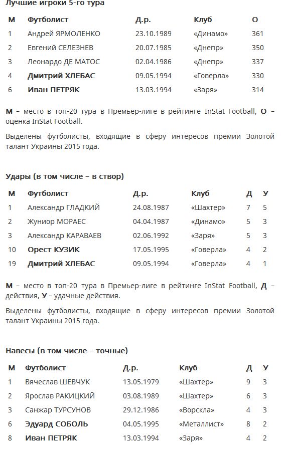 Вингер киевского "Динамо" Андрей Ярмоленко и арендованный у "бело-синих" "Говерлой" нападающий Дмитрий Хлебас в 5-м туре чемпионата Украины заняли 1-е и 4-е места соответственно среди лучших игроков по версии аналитической компании InStat Football.