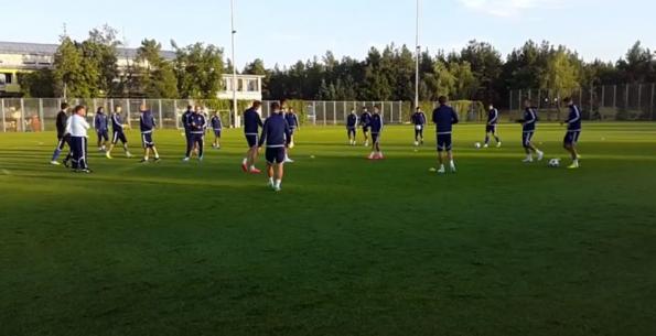 Игроки киевского "Динамо" разминаются на тренировке перед завтрашним матчем Лиги чемпионов с "Порту".