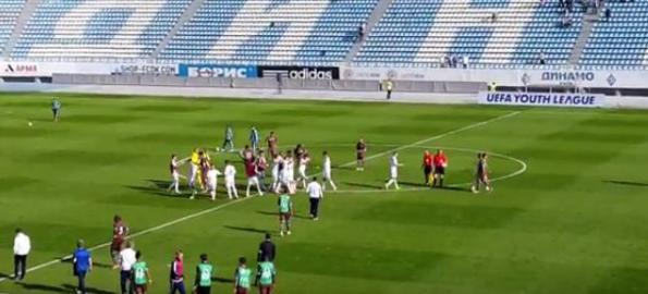 Игроки киевского "Динамо" U-19 поздравляют друг друга после победы над "Порту" в 1-м туре Юношеской лиги УЕФА.