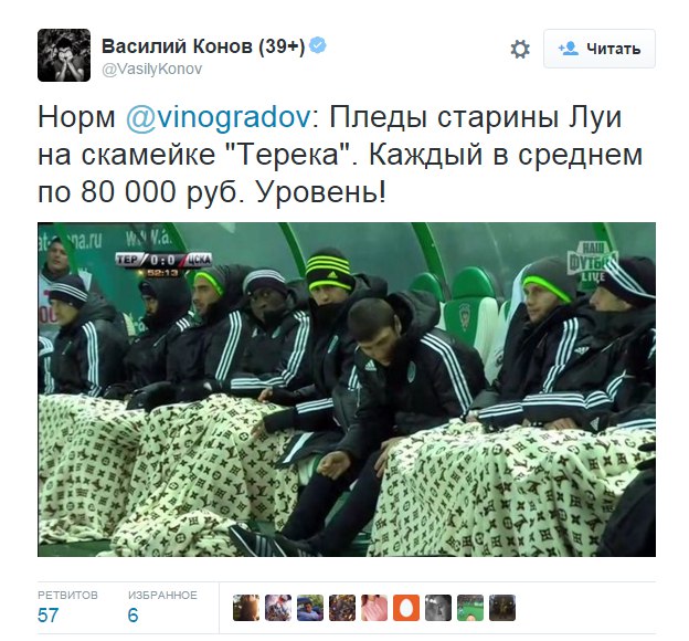 На матче "Терек" - ЦСКА запасные грозненского клуба были покрыты пледами от Louis Vuitton.