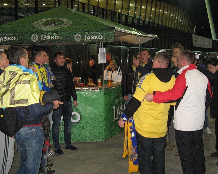 Волонтеры раздают бумажные трещетки, на которых с одной стороны — постер сборной Словении, с другой — национальный флаг. Именно их поднимет стадион во время исполнения национального гимна. Украинский же в исполнении болельщиков «сине-желтых» заглушавших музыку, болельщики хозяев выслушали с нескрываемым уважением и удивлением от уровня поддержки.