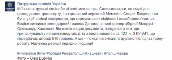 «Киевские патрульные полицейские заметили на ул. Саксаганского, на полосе для общественного транспорта, запаркованный красный Mercedes Coupe. Человек, который был в этой машине сообщил, что водитель отошел и вскоре появится. Водителем оказался легендарный игрок Динамо, а ныне тренер сборной Беларуси – Александр Хацкевич. Он охотно предоставил документы, согласился с тем, что припарковался в неположенном месте, и постановлением по ст. 122. ч. 3 КоАП, предусматривающей штраф 510 гривен», - звучит в заявлении официальной страницы патрульной полиции Украины в социальной сети Facebook.