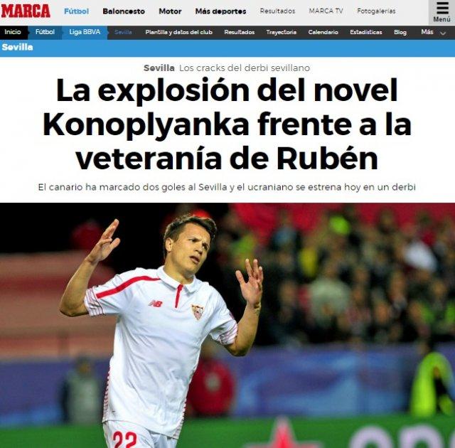 Ведущее спортивное издание Испании Marca считает вингера "Севильи" Евгения Коноплянку одной из двух главных звезд севильского дерби.