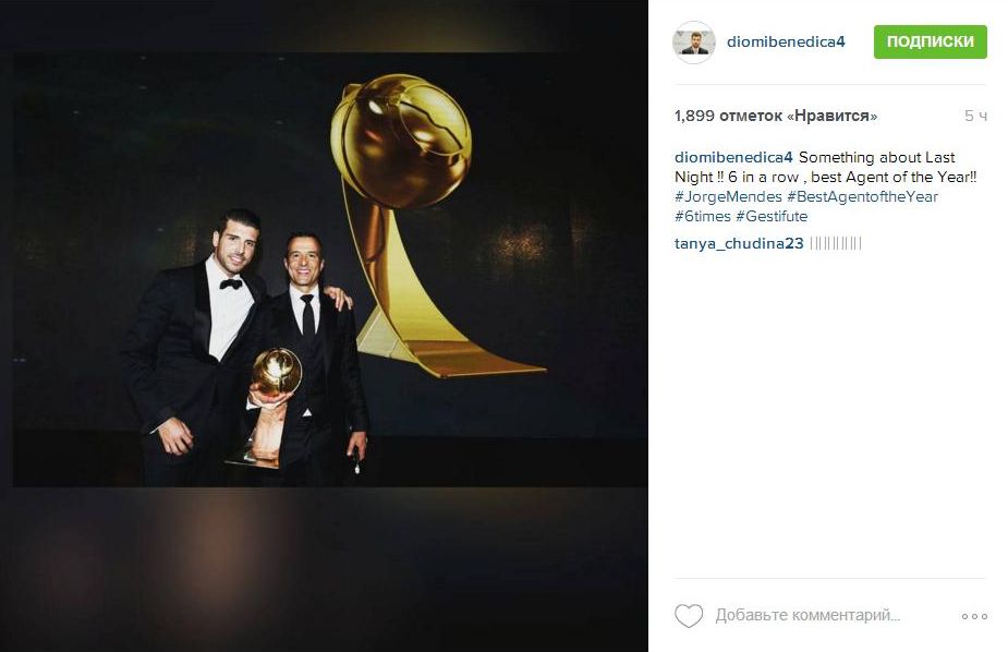 Полузащитник "Динамо" Мигел Велозу поздравил своего агента Жорже Мендеша с получением приза Globe Soccer Awards в номинации "Лучший агент года".
