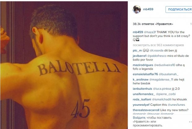 Одиозный итальянский форвард Марио Балотелли в своем инстаграме поделился фотографией, на которой его фанат сделал себе интересное тату.
