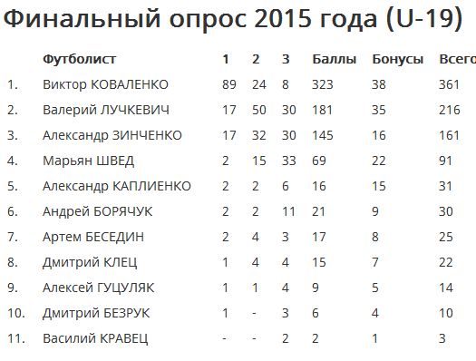 В 2015 году поначалу лидерство делили Лучкевич, который с «Днепром» шел к финалу Лиги Европы, а также Швед, уверенно дебютировавший в «Карпатах». Но летом в их спор уверенно вмешался Коваленко, который не только начал играть за основу «Шахтера», но и удостоился «Золотой бутсы» на ЧМ-2015 (U-20), а чуть раньше стал героем финальной стадии Юношеской лиги УЕФА.