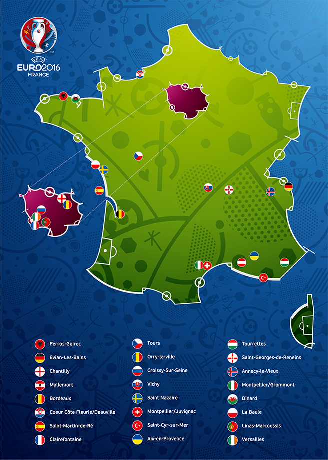 Все 24 участника ЕВРО-2016 определились со своими базами во Франции. Смотри, откуда твоя сборная начнет поход за трофеем следующим летом.