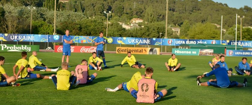 Тренувальною базою збірною є стадіон «Жорж Каркассон», який знаходиться в 10 хвилинах від готелю, де мешкає збірна. Символічно, що перше тренування стало відкритим для глядачів, які майже повністю заповнили трибуни місцевого стадіону. Українці, що приїхали з Марселю, Ніцци та інших куточків Франції, французи та багато місцевих дітей забезпечили збірній домашню атмосферу.