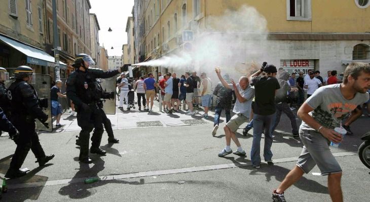 Марсельские полицейские используют слезоточивый газ, чтобы усмирить участников массовых драк, а в некоторых случаях применялись даже водометы.