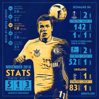 Украинский полузащитник "Шальке" Евгений Коноплянка опубликовал фото в Twitter с надписью: "Ноябрь в цифрах".
