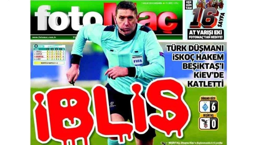 Номер Fotomac сегодня вышел с не требующим перевода заголовком: IBLIS «кровавым» шрифтом прямо по фотографии Крейга Томсона. Чуть ниже шотландского судью обозвали еще и «шайтаном»... «Это просто катастрофа. Крейг Томсон удалил Бека и поставил в наши ворота выдуманный пенальти при счете 0:1, - возмущается турецкий журналист. – После того, как во втором тайме за несдержанность был удален еще и Абубакар, «Орлы» проиграли матч с разгромным счетом и завершили выступления в Лиге чемпионов. Теперь команда продолжит свой путь в Лиге Европы. 6:0 от «Динамо» - это была просто судейская расправа. Два года назад, в плей-офф ЛЕ, «Бешикташ» в матче с «Брюгге» уже пострадал от фальшивого пенальти, который поставил не кто иной, как Крейг Томсон. Сегодня шотландский арбитр навредил нам опять! На 28-й минуте Бек даже не коснулся Гонсалеса, но Томсон, к ужасу турецких футболистов, моментально указал на «точку» да еще и красную карточку предъявил. (...) Деморализованный и ослабленный «Бешикташ» в дальнейшем пропускал гол за голом. Добавим также, что наши болельщики в Киеве подверглись атакам украинских хулиганов».