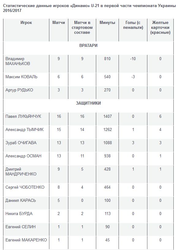 Подводим статистические итоги первой части сезона 2016/2017 в чемпионате U-21 для киевского «Динамо».