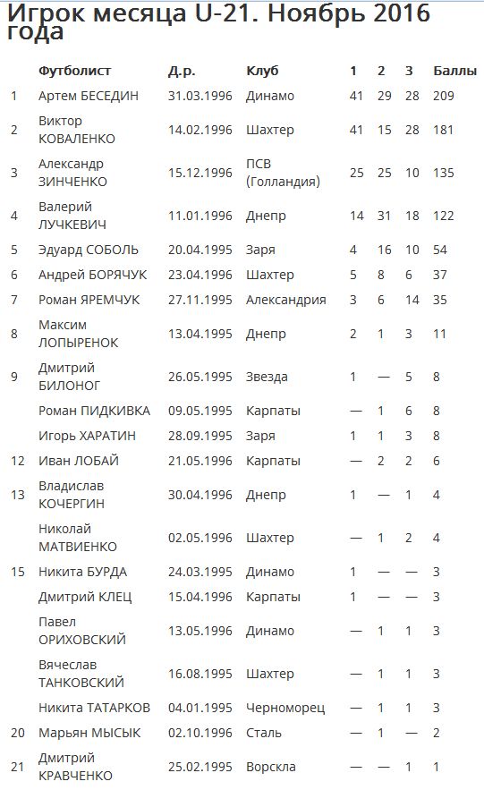 Беседина в своих анкетах упомянули 98 респондентов из 140, в число которых традиционно вошли тренеры, эксперты, журналисты и болельщики. Под первым номером он фигурировал 41 раз — столько же, сколько и Виктор Коваленко из Шахтера, который в октябре был третьим, в ноябре стал вторым, а до этого выиграл пять кряду месячных опросов премии Золотой Талант. Полузащитник горняков проиграл форварду Динамо совсем немного — 28 очков.