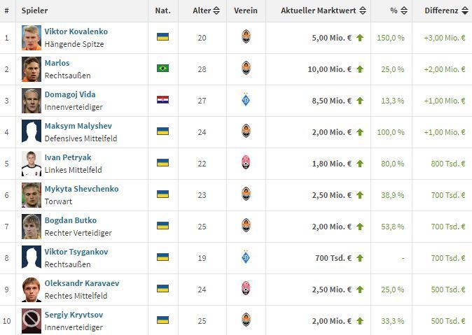 На втором месте идет партнер Виктора – бразилец Марлос, который «вырос» на 2 млн евро с 8 до 10 (25% прибавка). Третье место разделяют еще один Горняк Максим Малышев и трансферная цель многих европейских клубов – динамовец Домагой Вида. Малышев увеличил ссвою цену ровно в два раза, с одного до двух миллионов евро, а Вида теперь стоит 8,5 млн вместо 7,5 (13,3 % прибавки).