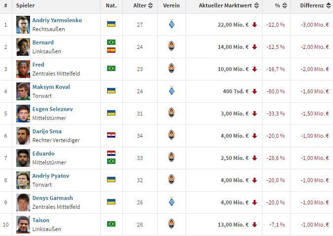 На другой стороне медали находятся более именитые игроки. Лидер чемпионов и сборной Украины Андрей Ярмоленко, так и не перебравшийся в европейский клуб, потерял в стоимости целых 3 млн евро, что является худшим показателем во всей УПЛ, хотя в процентном соотношении, потеря 12% стоимости не кажется такой уж огромной.