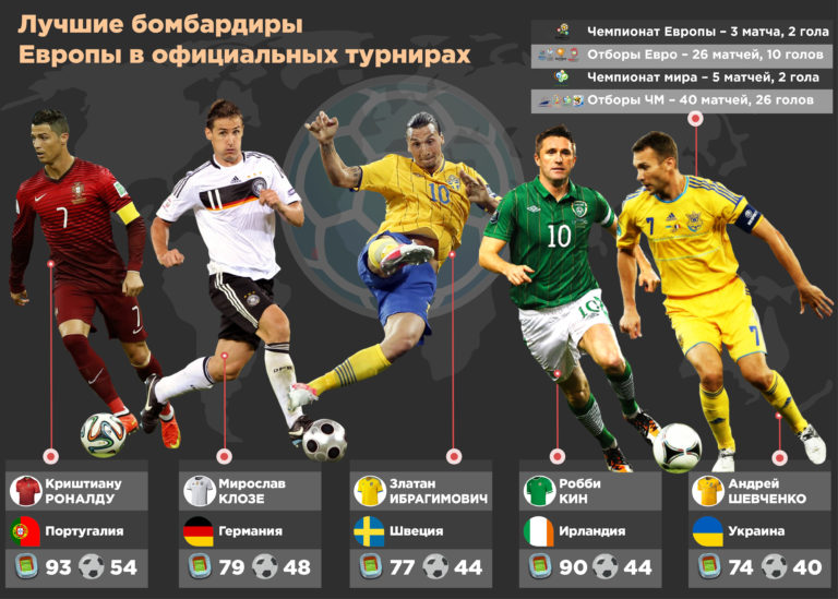 Лучшие бомбардиры сборных Европы в официальных турнирах. Топ-20