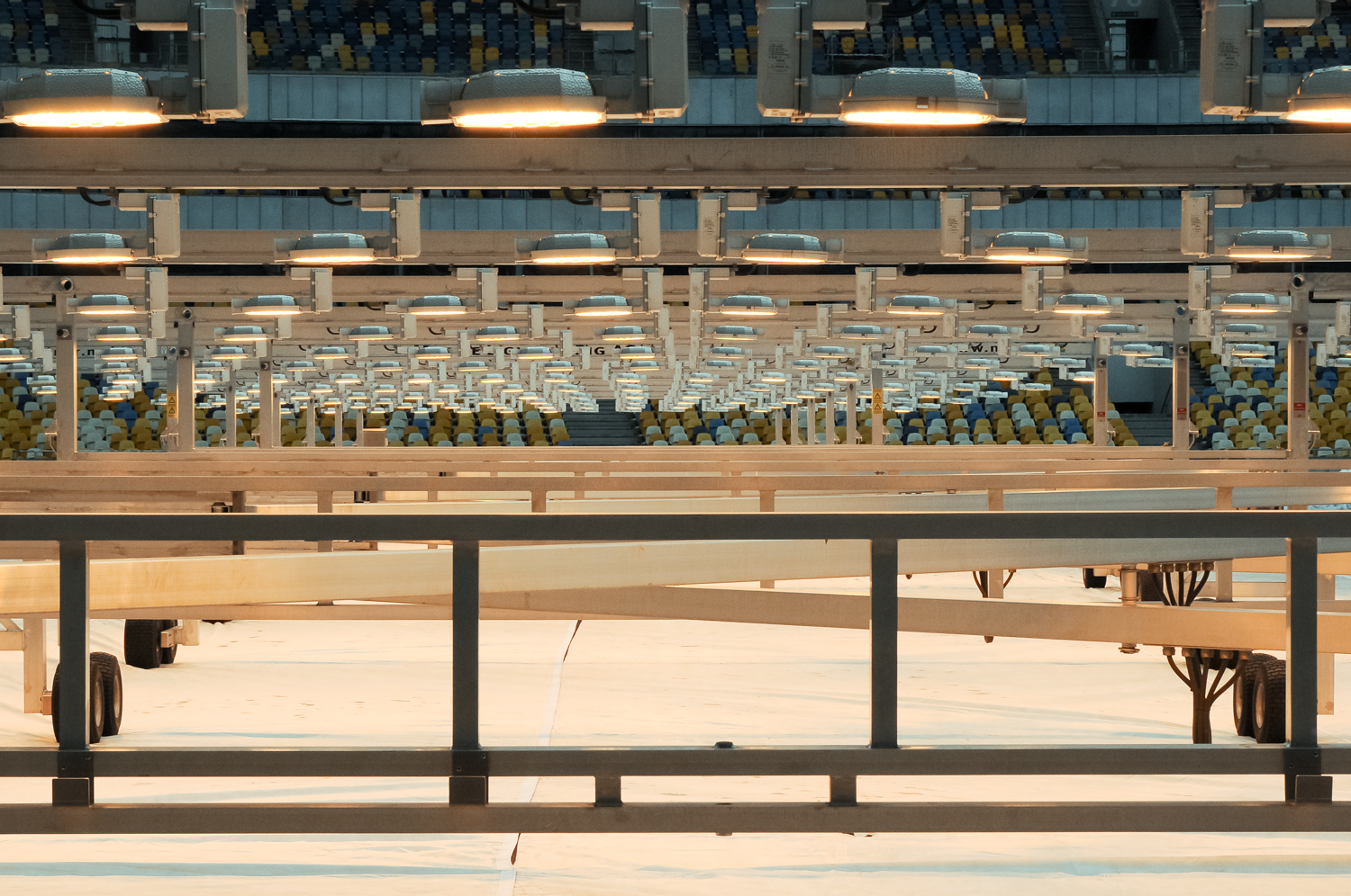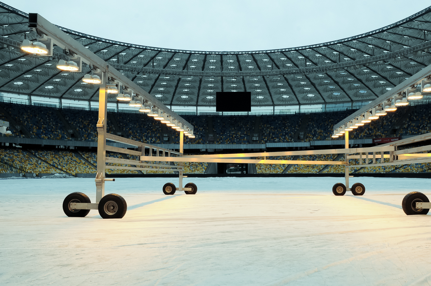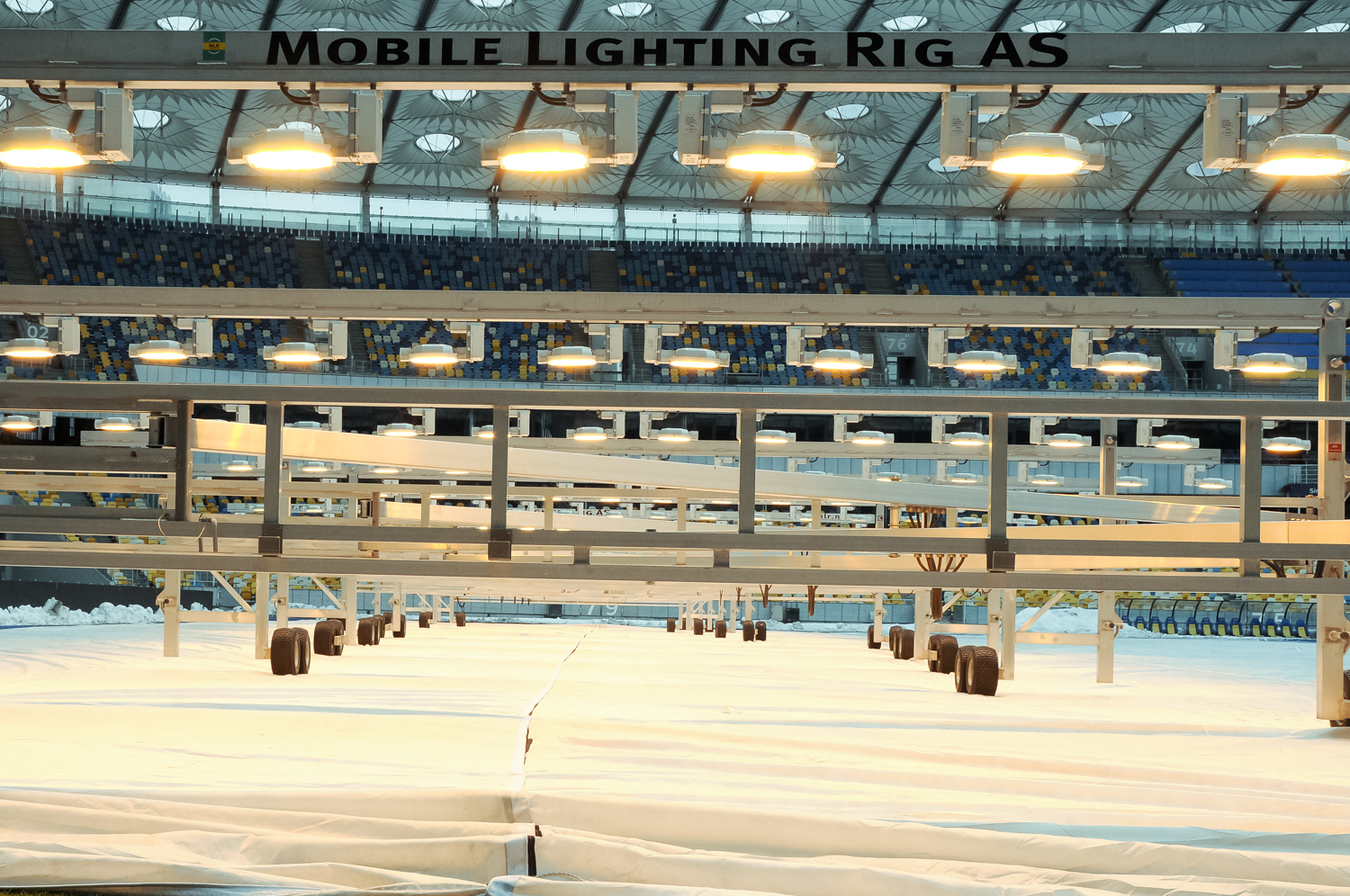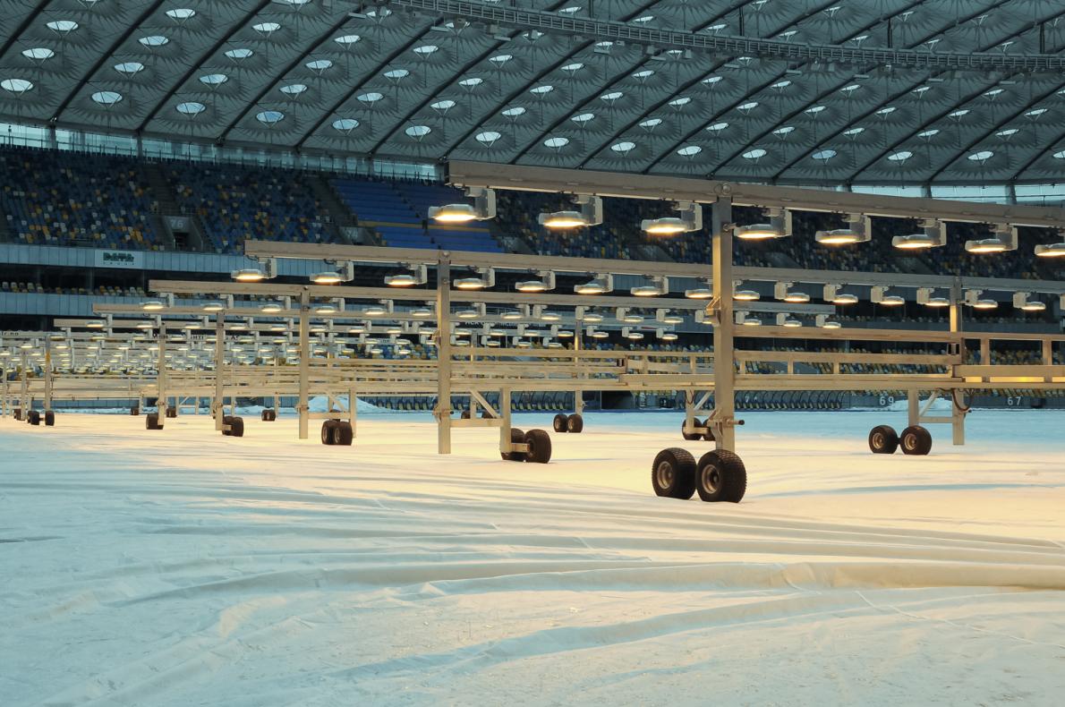 Главная спортивная и культурная арена страны – НСК «Олимпийский» – обогревает свое изумрудное поле с помощью специальных мобильных установок. Две установки заменяют естественный солнечный свет для газона в осенне-зимний период. Каждое из таких устройств для ухода за полем может одновременно освещать и обогревать 700 квадратных метров газона. Размер газона НСК «Олимпийский» составляет 7 887,5 кв.м., то есть каждые 14 часов искусственное солнце будет «кормить» 2 100 кв.м. газона или 1/4 часть поля. Несмотря на большие размеры установок, они совершенно не повреждают газон, так как сделаны из алюминия.