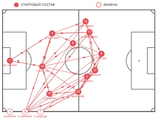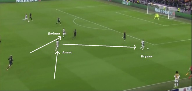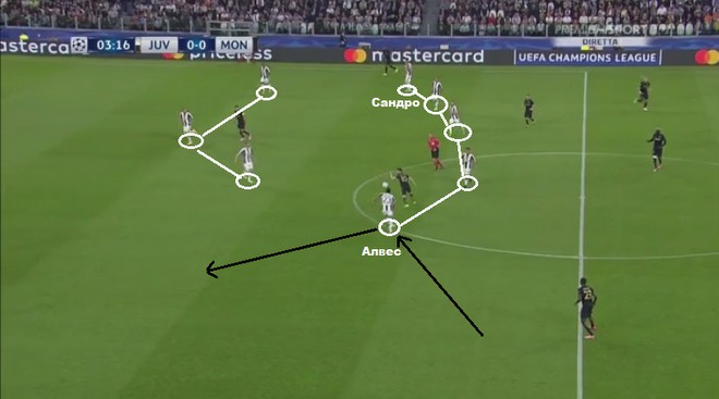 С помощью Алвеса и Алекса Сандро «Юве» создаёт мощный фронт атаки по всей ширине футбольного поля. Сами Хедира остаётся страховать опорную зону, в то время как Миралем Пьянич получает большую свободу при конструировании игры. Алвес и Сандро максимально растягивают фланги при атаке и максимально сужают при обороне. Вот простой пример: