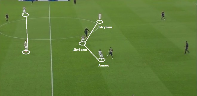 То же самое происходит и при прессинге. Алвес выдвигается на одну линию с Игуаином и Дибалой, перекрывая зоны передачи, заставляя того же Силву отыгрывать назад.