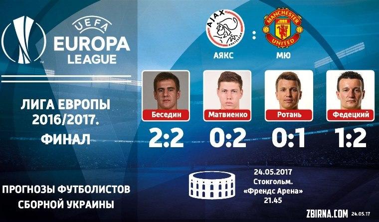 Артем БЕСЕДИН: «Мне почему-то кажется, что матч будет результативным. В нынешнем сезоне голландцы забивают много. Если не ошибаюсь, в среднем более двух мячей за игру. Манчестер Юнайтед не столь результативен, но англичанам кровь из носу нужна Лига чемпионов, попасть в которую можно лишь благодаря победе в Стокгольме. Мои симпатии будут на стороне Аякса, где выступает много молодых футболистов, но, думаю, победит все-таки МЮ — в серии пенальти…»