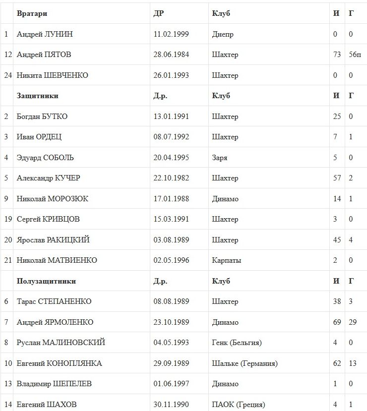 Официальный сайт УЕФА обнародовал заявочный лист сборной Украины на поединок с Финляндией. Туда, напомним, включают 23-х футболистов (в обязательном порядке — трех вратарей). На сборе в Австрии работали 25 украинских игроков, и в протокол матча не попали двое из них — полузащитник Зари Иван Петряк и нападающий Днепра Артем Довбык. В итоге официальная заявка на сегодняшний матч выглядит таким образом: