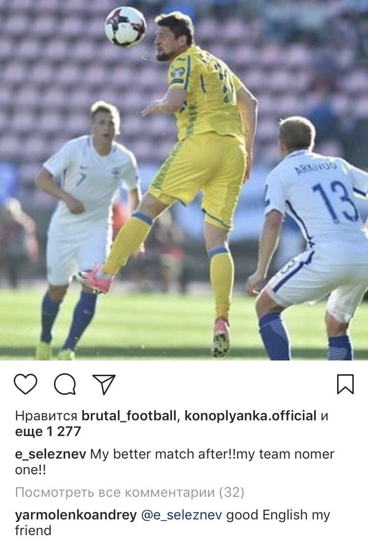 Евгений Селезнев опубликовал в своем Инстаграм фото после матча "Финляндия" - "Украина", на котором похвалил команду за победу над сборной Финляндии на английском языке. На фразу "my better match after!!my team nomer one" Ярмоленко саркастично написал "good English my friend".