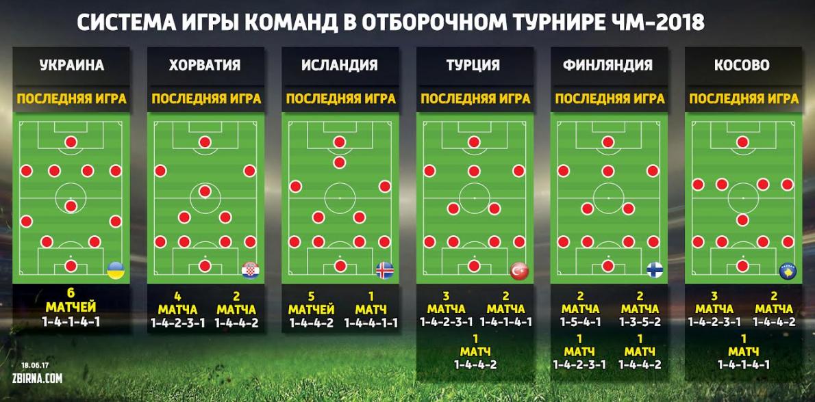В три защитника никто из нашей группы не играет. Разве что так играли финны, но у них было скорее пять представителей обороны, чем три. Вообще из 54-х европейских участников отборочного турнира ЧМ-2018 только 14 команд использовали такую тактику в защите в последний игровой день. В их число вошли, кстати, Германия, Бельгия, Уэльс и Сербия. Зато с двумя форвардами на поле вышло сразу 20 сборных! Среди них —такие команды, как Франция, Португалия, Италия, а также упомянутые уже Исландия и Германия. Понятно, что начальная расстановка футболистов во многом условна, но в сборной Украины ей, похоже, придают очень серьезное значение…