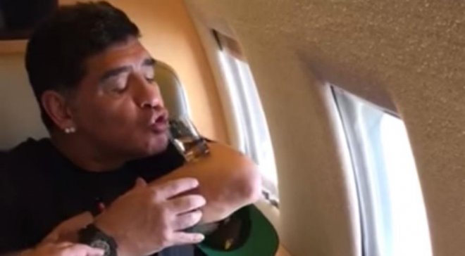 Марадона эффектно выпил водки "рукой Бога" в самолете, возвращаясь из России