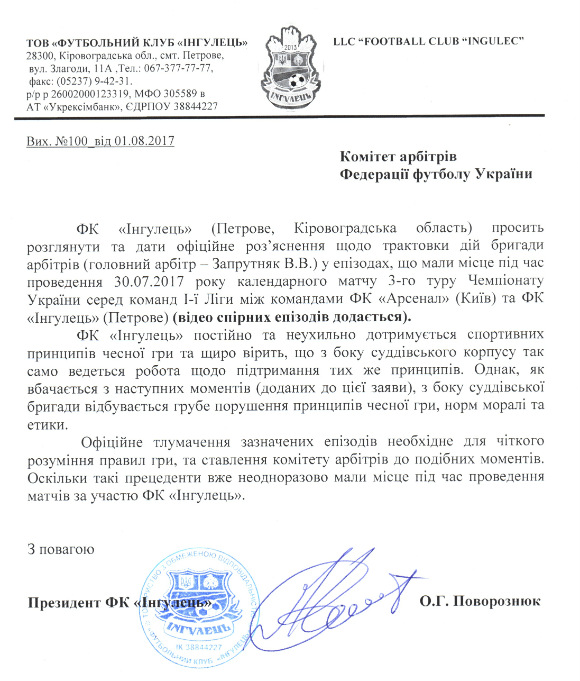 "Ингулец" обратился с открытым письмом в Комитет арбитров ФФУ