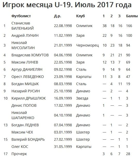 Лучшим футболистом Украины в категории U-19 в июле 2017 года признан нападающий Олимпика Станислав Биленький, который отодвинул на второе место Андрея Лунина. Вратарь, перебравшийся летом из Днепра в Зарю, уже успел дебютировать в основе бронзового призера. Но игра луганчан на старте сезона вызывала серьезные нарекания, а Лунин не каждый раз выходил в стартовом составе.