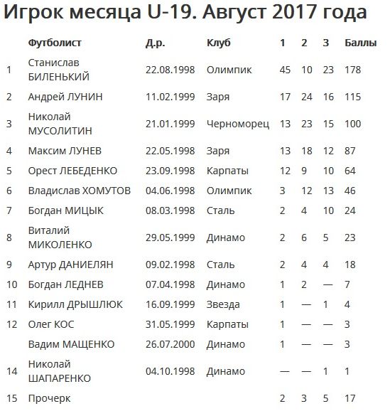 Лучшим футболистом Украины в категории U-19 в августе 2017 года признан нападающий Олимпика Станислав Биленький — второй раз кряду. До этого он победил в июльском голосовании проекта Золотой Талант. Вратарь Андрей Лунин, который выиграл три весенних опроса, вновь оказался вторым. Причем отставание от лидера оказалось больше, чем отрыв от третьего в рейтинге — полузащитника Черноморца Николая Мусолитина.
