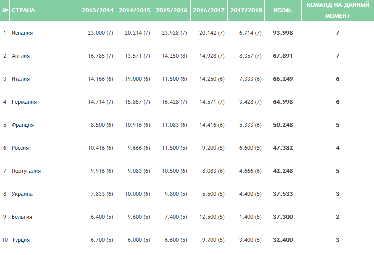 После вчерашнего игрового дня еврокубков Украина обошла Бельгию в таблице коэффициентов УЕФА и теперь занимает 8-е место.