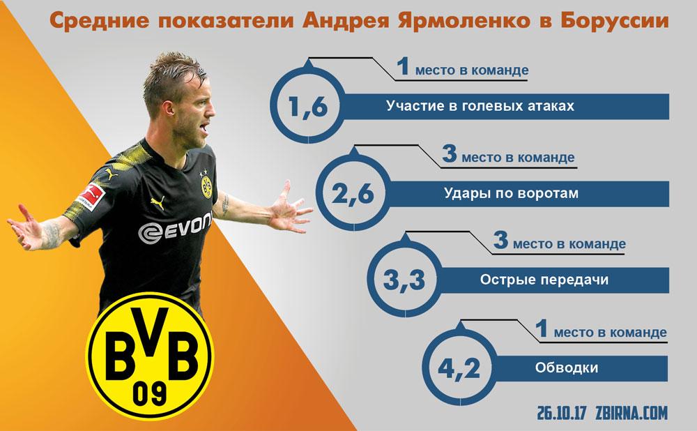 За то время, которое Андрей Ярмоленко находился на поле, Боруссия забила 18 мячей. Получается, что полузащитник сборной Украины принимает участие в 67% голов своей команды.