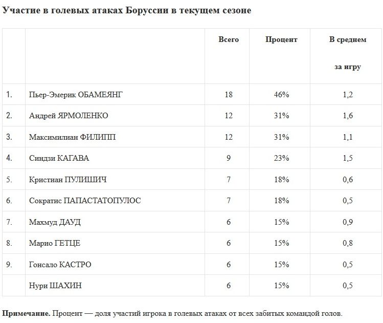 По числу участий в голевых атаках Ярмоленко, например, уступает только Пьеру-Эмерику Обамеянгу, а по системе гол + пас занимает третье место (три плюс четыре). Впрочем, если анализировать средние показатели нашего футболиста, то здесь он — один из самых полезных игроков дортмундской команды.