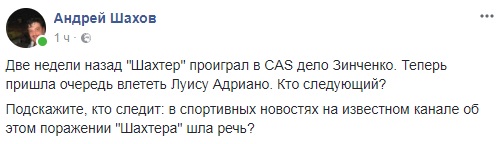 Андрей ШАХОВ: "Кто следит: в спортивных новостях на известном канале о поражении "Шахтера" по делу Адриану шла речь?"