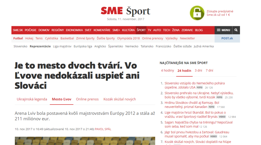 На окраине города расположена "Арена Львов", где сегодня сыграет сборная Словакии. Это идеальный футбольный стадион. "Великолепный, современный и удобный", - так характеризует его наш защитник Петер Пекарик, который всего три недели назад играл здесь в составе "Герты" (1:2 от "Зари" в ЛЕ). Его построили за 211 миллионов евро специально к Евро-2012. Предполагалось, что там будут проходить домашние матчи "Карпат", но владелец клуба Петр Дыминский вскоре отказался от такого предложения. Ему не понравилась высокая аренда, но официально названная причина была абсурдной – якобы это несчастливый стадион для "Карпат", которые дважды потерпели поражение на "Арене Львов". Как бы то ни было, а для национальной сборной эта арена очень счастливая – Украина там никому не проигрывает. Словаки не стали исключением". Пан Спал вообще очень много написал о жизни в Украине, не забыл даже упомянуть о зарплате, которая "здесь в четыре раза ниже чем у нас". Тем не менее, "ведущие украинские клубы могут на равных состязаться с европейскими грандами. Возьмем хотя бы "Шахтер", который недавно обыграл "Наполи" с нашим Мареком Хамшиком!" Репортаж о самом матче на этом фоне не был оригинальным: "Козак проверил новичков, Словакия проиграла из-за грубых ошибок… Украинцы подтвердили свою страсть к футболу. На стадионе царила потрясающая атмосфера, словно во время какого-то крупного турнира. 30-тысячный стадион был заполнен до отказа, болельщики пели гимн, прыгали, скандировали "Украина, Украина" и запускали волну… Словакия играла в непривычном составе, и это чувствовалось по ходу матча. Периодически нашей сборной удавалось создавать хорошие моменты, но хозяева играли немного лучше". Кроме того, в эпизоде с голом Коноплянки автор отмечает ошибку вратаря-дебютанта Полачека.