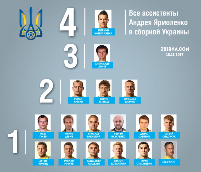 Хороший футболист быстро находит общий язык с новыми исполнителями, и пример Андрея Ярмоленко, который сразу заиграл в дортмундской Боруссии, — тому подтверждение, пишет zbirna.com. Нет никаких проблем со взаимопониманием с партнерами у бывшего хавбека Динамо и в сборной Украины. Как выяснилось, в составе национальной команды ее лучший из действующих бомбардиров забивал голы после передач 17-ти (!) исполнителей.