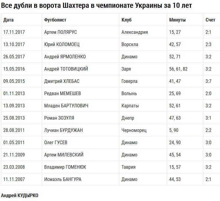 Впервые футболист Александрии забил два мяча в одном матче чемпионата Украины с Шахтером. За последние 10 лет это 13-й случай. С ноября 2007 года по май 2011-го в основном этим обычно могли похвастать динамовцы. Но постепенно горняки начали позволять слишком много представителям и других клубов.