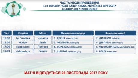 Стали відомі місця проведення поєдинків 1/4 фіналу розіграшу Кубка України з футболу сезону 2017/2018 років, а також час початку матчів.