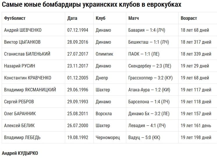 В последнее время в списке самых юных бомбардиров украинских клубов в еврокубках происходит постоянное обновление. В сентябре 2016 года Виктор Цыганков занял вторую строчку в рейтинге — следом за Андреем Шевченко. В июле 2017-го Станислав Биленький поднялся на третье место, а 23 ноября в матче Динамо со Скендербеу в Албании Назарий Русин стал бомбардиром №4.